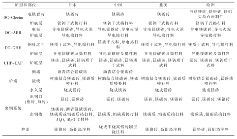 摘 要:由三根電極的普通交流電弧爐發(fā)展為超高功率(UHP)及一根電極的直流(DC)電弧爐,爐體結(jié)構(gòu)有一些改變。針對各部位的損毀因素,內(nèi)襯用的耐火材料也有所發(fā)展。例如普通電弧爐的爐頂用高鋁磚、爐墻鎂磚砌筑,而UHP及DC電弧爐采用大面積水冷爐頂、爐墻,爐頂三角區(qū)采用剛玉澆注料或預(yù)制件,爐墻用鎂碳磚,蝕損嚴(yán)重部位采用噴補(bǔ)作業(yè)。還介紹了日本等一些國家DC和UHP的各種爐型用耐火材料。煉鋼電弧爐是以電極端部和爐料之間發(fā)生的電弧為熱能進(jìn)行煉鋼的設(shè)備。電弧爐以廢鋼為爐料直接煉鋼,與礦石煉鐵后再煉鋼相比,基建投資少,節(jié)能60%、節(jié)水40%、減少廢氣排放86%、減少廢渣97%[1]。交流電弧爐歷史悠久,交流電是通過三根石墨電極輸入爐內(nèi),在電極下端與金屬料之間產(chǎn)生電弧,利用電弧高溫直接加熱爐料,使煉鋼過程得以進(jìn)行。供電功率越高,爐料熔化速度越快,降低能量消耗越多,因此出現(xiàn)超高功率(UHP)電弧爐。在超高功率的基礎(chǔ)上發(fā)展了直流(DC)電弧爐煉鋼。直流電弧爐是以一根石墨電極的端點(diǎn)為陰極,爐底為陽極,石墨電極位于爐膛中心部位。與UHP相比設(shè)備結(jié)構(gòu)簡單,建設(shè)費(fèi)用低,熔池中的電流與熱量分布比較均勻,不存在過熱區(qū)域,因此耐火材料損耗比較小、節(jié)能且噪音小等。目前,煉鋼電弧爐向大型化、控制自動化方向發(fā)展。我國的電弧爐主要用來生產(chǎn)合金鋼。煉鋼水平與工業(yè)發(fā)達(dá)國家相比差距較大,如2015年我國電爐鋼占粗鋼總產(chǎn)量的6.1%,2020年有所提高,但也不超過10%,與世界平均水平的30%相比還有較大差距。我國已經(jīng)引進(jìn)先進(jìn)水平的UHP和DC電弧爐,隨著經(jīng)濟(jì)發(fā)展,工業(yè)化程度提高,必然伴以廢鋼資源數(shù)量增加,同時發(fā)展鐵礦石直接還原煉鐵技術(shù),代替廢鋼,增加電弧爐煉鋼的爐料,還有核電的發(fā)展,使電弧爐煉鋼有了物質(zhì)保證。電弧爐的內(nèi)襯是耐火材料構(gòu)成的,隨著UHP和DC技術(shù)的發(fā)展,需要新型優(yōu)質(zhì)耐火材料與之相配套。有人說[2]:沒有優(yōu)質(zhì)爐襯、爐底耐火材料支持長壽爐齡,超高功率電弧爐就無法發(fā)揮高效生產(chǎn)的優(yōu)勢。爐底耐火材料是直流電弧爐得以實(shí)現(xiàn)的必要條件,反映了煉鋼與耐火材料技術(shù)的互相影響,互為依存,在電弧爐煉鋼系統(tǒng)優(yōu)化生產(chǎn)中有不可分割的作用。1 電弧爐的結(jié)構(gòu)變化傳統(tǒng)的電弧爐由爐頂(又稱爐蓋)、爐墻、爐坡、爐底和出鋼槽構(gòu)成,全部用耐火材料構(gòu)筑,外包鋼制爐殼。爐墻一側(cè)設(shè)有爐門,另一側(cè)為出鋼口,并與出鋼槽相連。而UHP和DC電弧爐采用偏心爐底出鋼,使?fàn)t體由傾動式改為固定式,爐底有供氣攪拌設(shè)置,爐頂安裝氧-燃料燒嘴,在爐底偏心位置設(shè)置出鋼口,代替出鋼槽。由于取消了傾動設(shè)備,擴(kuò)大了水冷面積,緩和了爐襯的損毀,適當(dāng)降低了出鋼溫度,并縮短了出鋼時間,從而降低生產(chǎn)成本。爐墻采用鑲砌水冷箱式水冷套措施,其內(nèi)表面噴涂一層耐火涂料,使其掛渣形成保護(hù)層,可有效降低耐火材料消耗,但電耗可能增加。國外有的電弧爐功率達(dá)1 000 kV·A/t以上,爐墻壽命達(dá)2 000爐次以上,水冷爐蓋壽命達(dá)4 000爐次,降低耐火材料消耗60%以上。2 耐火材料內(nèi)襯的損毀因素電弧爐內(nèi)襯的耐火材料長期處于高溫、熔渣侵蝕和急熱急冷狀態(tài)下,工作條件極其惡劣。在煉鋼的熔化期和氧化期,不致于因高溫?fù)p壞爐襯,但在還原期的鋼液溫度相當(dāng)高,又受電弧直接輻射(有時溫度達(dá)4 000℃以上),爐襯很容易造成熔融損壞。出完鋼裝料時,爐襯溫度突然下降,裝完料開始送電,溫度又逐漸升高,這種急冷急熱是爐襯剝落的直接原因,主要是爐頂容易剝落。耐火材料內(nèi)襯損毀的主要因素包括[3]:(1)化學(xué)侵蝕。FeO或渣中SiO2與耐火材料中的CaO、MgO之間的化學(xué)反應(yīng),使?fàn)t襯變?yōu)槿墼鴮?dǎo)致?lián)p毀。(2)耐火材料內(nèi)襯中的碳成分被含氧成分(如FeO、O2、MgO等)氧化,導(dǎo)致耐火材料脫碳而損毀。(3)沖刷和機(jī)械沖擊。鋼水或熔渣流過耐火材料表面,以物理性磨損或沖刷爐襯,而導(dǎo)致內(nèi)襯損毀;在出鋼口、渣線、電極口或排氣口平臺等沖刷嚴(yán)重,廢鋼等爐料吊入往往撞擊爐襯而損毀。(4)水化。在生產(chǎn)過程中,往往會出現(xiàn)爐頂或爐墻漏水或滲水,還有水蒸氣,與堿性耐火材料中的MgO、CaO進(jìn)行水化反應(yīng),使內(nèi)襯損毀。3 電弧爐用耐火材料根據(jù)電弧爐的結(jié)構(gòu),由于各部位承受的熱負(fù)荷大小不同,與熔渣、鋼水接觸作用及機(jī)械損壞程度存在差異,不同部位必須采用不同的耐火材料[4]。3.1 爐頂(蓋)我國中小電弧爐普遍采用燒成或不燒高鋁磚,局部用高鋁質(zhì)或剛玉質(zhì)不定形耐火材料預(yù)制件。大型超高功率電弧爐和直流電弧爐采用水冷技術(shù),除三角區(qū)外,爐頂耐火材料不是關(guān)鍵。三角區(qū)由于強(qiáng)烈熱震及電極熱輻射苛刻,國外普遍采用剛玉質(zhì)或鋁鉻質(zhì)搗打料,我國一般用高鋁質(zhì)或剛玉質(zhì)搗打料。天津鋼管集團(tuán)公司150 t超高功率電弧爐,爐頂三角部分(三個